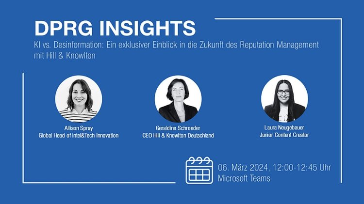Wir freuen uns darauf, mit Dir gemeinsam einen exklusiven Einblick in die Arbeit von H&K zu bekommen und die Möglichkeiten zu diskutieren, die diese KI für die Prävention und Bewältigung von Reputationsrisiken bietet. Um Dir darüber hinaus die Möglichkeit zu geben, direkt mit einer Person zu sprechen, die das Tool seit Tag eins kennt, gestalten wir die Session bilingual. Mit dabei sind Allison Spray, Global Head of Intel&Tech Innovation, Geraldine Schroeder, CEO und Laura Neugebauer, Junior Content Creator bei Hill & Knowlton.
