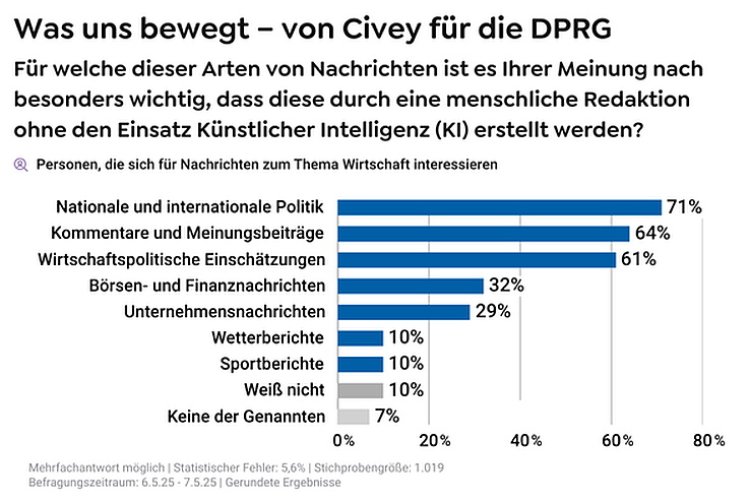 Laut einer aktuellen Civey-Studie für das Handelsblatt unter Personen, die sich für Wirtschaftsnachrichten interessieren, halten 71 Prozent der Befragten es für besonders wichtig, dass Nachrichten zu nationaler und internationaler Politik von Journalist:innen ohne KI erstellt werden. Auch bei Kommentaren und Meinungsbeiträgen (64 Prozent) sowie wirtschaftspolitischen Einschätzungen (61 Prozent) erwarten Leserinnen und Leser journalistische Expertise.